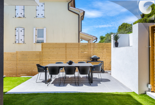 Der Hof erstreckt sich auf 500 m² mit Gartenmöbeln, Liegestühlen, Parkplatz, Schaukel und Infinity-Pool. Die charmante und fröhliche Villa bietet maximalen Spaß für alle Altersgruppen, für die ganze Familie und Freunde.