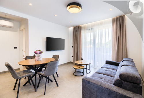 Two bedrooms, one with double bed(180x200) and other with two separate beds (90x200), living room and kitchen, bathroom and balcony. One person has a possibility of sleeping on sofa bed in the living room. Kitchen is fully equipped with cutlery and cookery, fridge and freezer, dishwasher, oven and microwave (combo), water heater and filter coffee machine. All rooms are air-conditioned. Also provided to the guests are: WiFi, Smart TV / Sat, beddings, towels and one parking spot. Guests can use a shared washing machine in the building. Pets are not allowed.