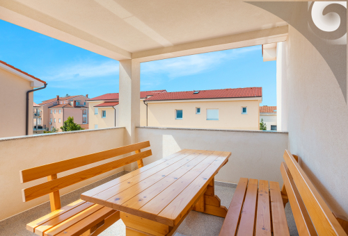 This second floor apartment can accommodate 7 people. With its 100 m² size, apartment offers: three bedrooms (each with its own bathroom), living room, kitchen, separate WC and terrace. Kitchen is equipped to highest standards and has: fridge with freezer, electric stove, oven, microwave, dishwasher, filter coffee machine and water boiler. Guests also have washing machine, SAT/TV, WiFi and grilling possibility. Bed sheets and towels are included in price. Air conditioning is in the living room and in the hallway. Guests have 2 parking spaces. Pets are not allowed.