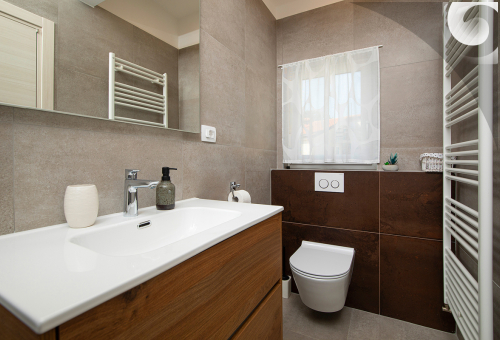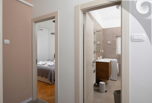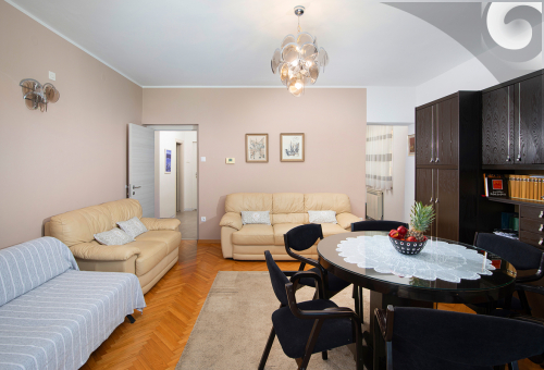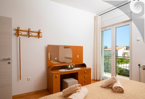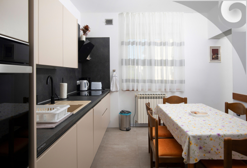 This lovely house is located in a perfect location, only 550m from sandy beach and 300m from tourist center. A fenced yard, free parking, the possibility of grilling and a modern interior make this apartment an ideal choice for your next vacation. The apartment is located on the 1st floor of the house and can accomodate 6-8 people. With its size of 100 m², the apartment offers: a living room equipped with the possibility of sleeping, a kitchen, three bedrooms, two bathrooms and a balcony. The kitchen contains a refrigerator, electric stove, oven, dishwasher and coffee machine. Living room and all bedrooms are air-conditioned. Guests also have a washing machine, WiFi, their own safe, bed linen and towels. Pets are allowed (Maximum ONE pet), with extra cost of 10 Eur / Day / per Pet. Parking for two cars is provided.
