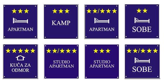 Na ulazu u vaš smještajni objekt ili negdje u neposrednoj blizini ulaza trebate na vidljivom mjestu postaviti standardiziranu plavu ploču, tj. natpis koji označuje vrstu i kategoriju objekta). To može biti apartman, soba, studio apartman, kuća za odmor itd.