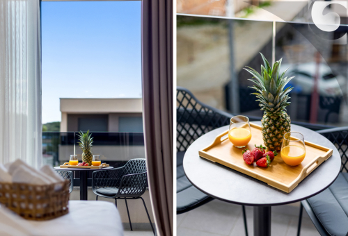 Kupaonicu, Balkon s djelomičnim pogledom na more, Bračni krevet (180x200), TV/Sat i mali frižider.