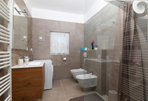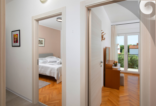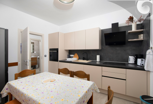 Ova prekrasna kuća nalazi se na savršenoj lokaciji, samo 550 m od pješčane plaže i 300 m od turističkog centra. Ograđeno dvorište, besplatno parkiranje, mogućnost roštiljanja i moderan interijer čine ovaj apartman idealnim izborom za vaš sljedeći odmor. Apartman se nalazi na 1. katu kuće i može primiti 6-8 osoba. Sa svojom veličinom od 100 m², apartman nudi: dnevni boravak opremljen mogućnošću spavanja, kuhinju, tri spavaće sobe, dvije kupaonice i balkon. Kuhinja sadrži hladnjak, električni štednjak, pećnicu, perilicu posuđa i aparat za kavu. Dnevni boravak i sve spavaće sobe su klimatizirane. Gosti također imaju perilicu rublja, WiFi, vlastiti sef, posteljinu i ručnike. Kućni ljubimci su dozvoljeni (maksimalno JEDAN ljubimac), uz nadoplatu od 10 Eur/dan/po ljubimcu. Osigurano je parkirno mjesto za dva automobila.