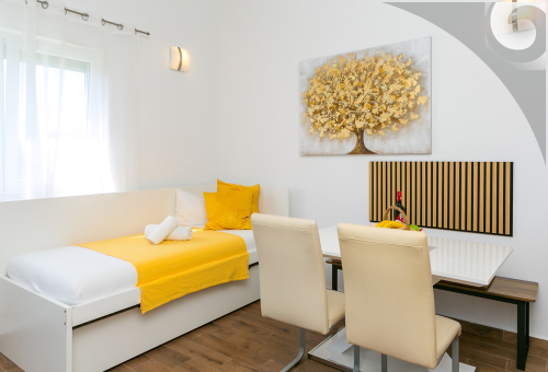 Apartman je smješten na prvom katu kuće i može ugostiti 2 do 3 osobe. Svojom veličinom od 40 m² apartman nudi: jednu spavaću sobu s bračnim krevetom, klimatizirani dnevni boravak s mogućnošću spavanja dviju osoba, kuhinju, kupaonicu i balkon. Kuhinja je opremljena te ima hladnjak sa zamrzivačem, električni štednjak s pećnicom, aparat za kavu i kuhalo za vodu. Gosti također imaju internet, posteljinu i ručnike.