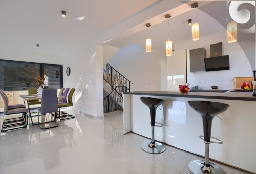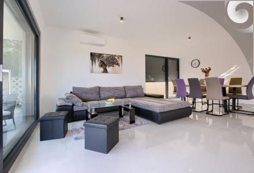 Dispone di una cucina completamente attrezzata con zona pranzo e di un soggiorno luminoso e aperto arredato con grande gusto con accesso diretto alla terrazza della villa.