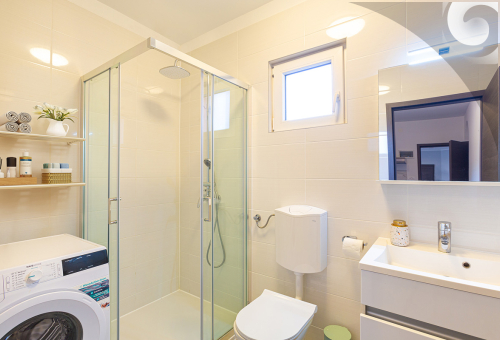 Questo appartamento al piano terra può ospitare 5 persone. L'appartamento offre: due camere da letto, un bagno, soggiorno con possibilità di letto singolo, cucina e terrazza privata con barbecue. La cucina è attrezzata con piano cottura elettrico, forno, microonde, lavastoviglie, frigorifero e macchina per il caffè. Tutte le camere da letto e il soggiorno sono dotati di aria condizionata. Sono inoltre disponibili lavatrice, asciugacapelli, lenzuola e asciugamani.